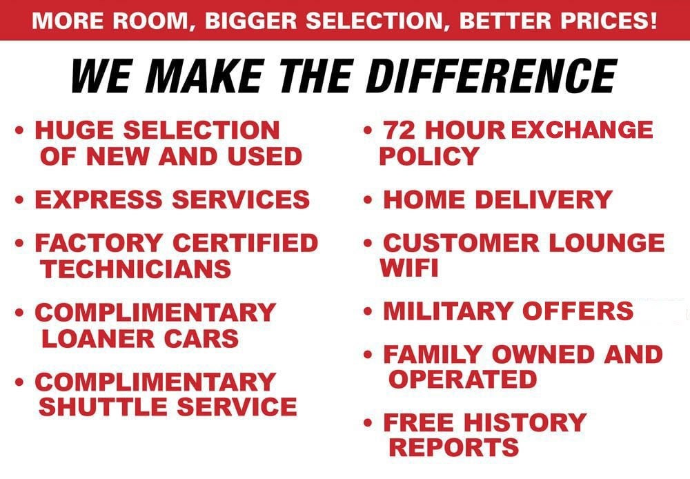 All prices plus tax, tag, title, $225.00 documentary fee and dealer added options, or any other fees required by law. We have taken reasonable efforts to ensure display of accurate data; however, the information shown may contain errors and omissions, may not reflect all vehicle items and accessories, and errors with regard to pricing may occur. All displayed inventory is subject to prior sale and all prices expire at midnight on the date displayed. Price shown is for the state in which Dealer is physically located and if transferred to another state, the price may change. Dealer is not responsible for any errors but should be consulted in person to confirm the information on this page. USED VEHICLES MAY BE SUBJECT TO UNREPAIRED MANUFACTURER RECALLS. PLEASE CONTACT THE MANUFACTURER OR A DEALER FOR THAT LINE MAKE FOR RECALL ASSISTANCE/QUESTIONS OR CHECK THE NATIONAL HIGHWAY TRAFFIC SAFETY ADMINISTRATION WEBSITE FOR CURRENT RECALL INFORMATION BEFORE PURCHASING.