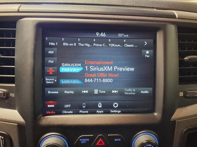This vehicle comes equipped with: Chrome Plus Package (17 x 7 Aluminum Wheels, 40/20/40 Split Bench Seat, Bright Front Bumper, Bright Grille, Bright Rear Bumper, Carpet Floor Covering, Center Hub, Cloth 40/20/40 Bench Seat, Front Armrest w/3 Cupholders, Front Floor Mats, Manual Adjust Seats, Rear Floor Mats, Rear Folding Seat, and Remote Keyless Entry w/All-Secure), Electronics Group (1-Year SiriusXM Guardian Trial, 8.4 Touchscreen Display, Air Conditioning ATC w/Dual Zone Control, Apple CarPlay, Cluster 7.0 TFT Color Display, For More Info, Call 800-643-2112, Google Android Auto, HD Radio, Media Hub (2 USB, AUX), No Satellite Coverage w/HI/AK/PR/VI/GU, Radio: Uconnect 4C w/8.4 Display, SiriusXM Radio Service, SiriusXM Satellite Radio, and USB Host Flip), Quick Order Package 29B Tradesman, Tradesman Package, 17 x 7 Steel Wheels, 3.21 Rear Axle Ratio, 4-Wheel Disc Brakes, 6 Speakers, ABS brakes, Active Grille Shutters, Air Conditioning, AM/FM radio, Black Exterior Mirrors, Brake assist, Charge Only Remote USB Port, Compass, Delay-off headlights, Driver door bin, Dual front impact airbags, Dual front side impact airbags, Electronic Shift, Electronic Stability Control, Exterior Mirrors w/Heating Element, Front anti-roll bar, Front Center Armrest, Front License Plate Bracket, Front wheel independent suspension, Fully automatic headlights, Heated door mirrors, Heavy Duty Vinyl 40/20/40 Split Bench Seat, Low tire pressure warning, Occupant sensing airbag, Outside temperature display, Overhead airbag, Overhead console, ParkView Rear Back-Up Camera, Passenger door bin, Power door mirrors, Power steering, Power windows, Radio data system, Radio: Uconnect 3 w/5 Display, Rear anti-roll bar, Rear step bumper, Rotary Shifter-Black, Speed control, Tachometer, Tilt steering wheel, Tip Start, Traction control, Variably intermittent wipers, and Voltmeter.